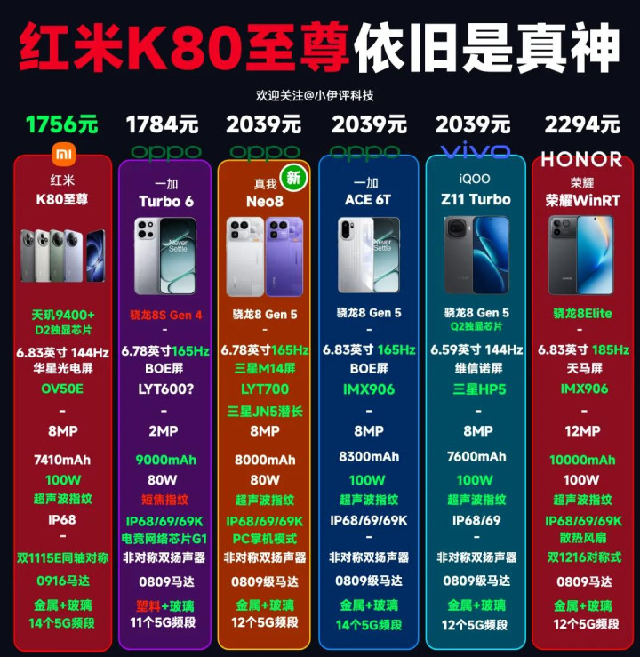 而这些价格虚高的产品,最一票中端机——一加ACE 6T、真我Neo8、iQOO Z11 Turbo,有一个算一个,打得过红米K80至尊版么?