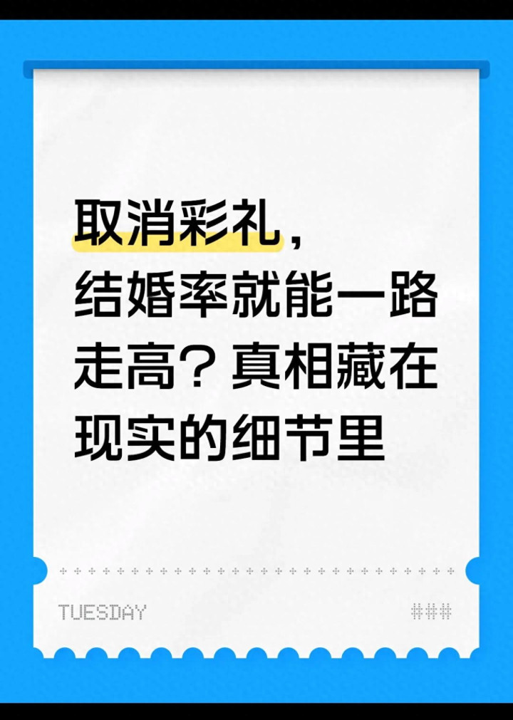 那么问题来了:当天价彩礼的泡沫被戳破,当婚姻不再被金钱裹挟,我们该如何重新定义彩礼的意义?又该如何搭建更公平的婚姻市场、给足双方足够的安全感,让更多人敢走进婚姻、愿经营婚姻?这或许比单纯讨论“是否取消彩礼”,更值得我们深思。