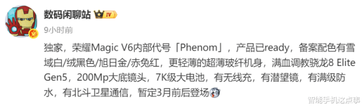 原因很简单,那就是有博主把荣耀Magic V6的底裤都给扒干净了,并且称新机的内部代号「Phenom」(现象级/杰出人才)。