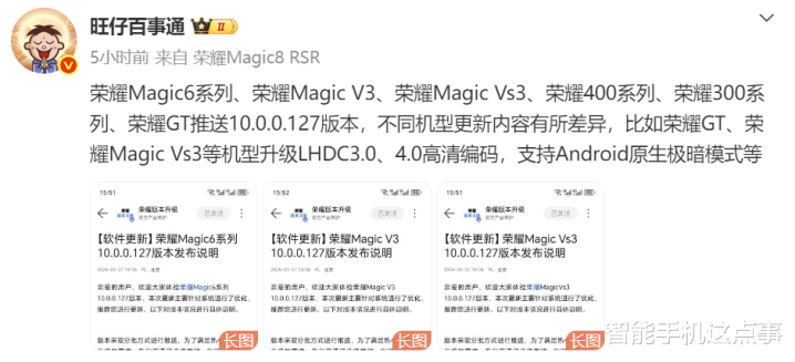 但荣耀最近这波操作有点反常态,比如在1月27日,荣耀一口气给Magic6系列、Magic V3/Vs3折叠屏,甚至荣耀GT、400/300这些中端线,全量推送了MagicOS 10.0.0.127版本。
