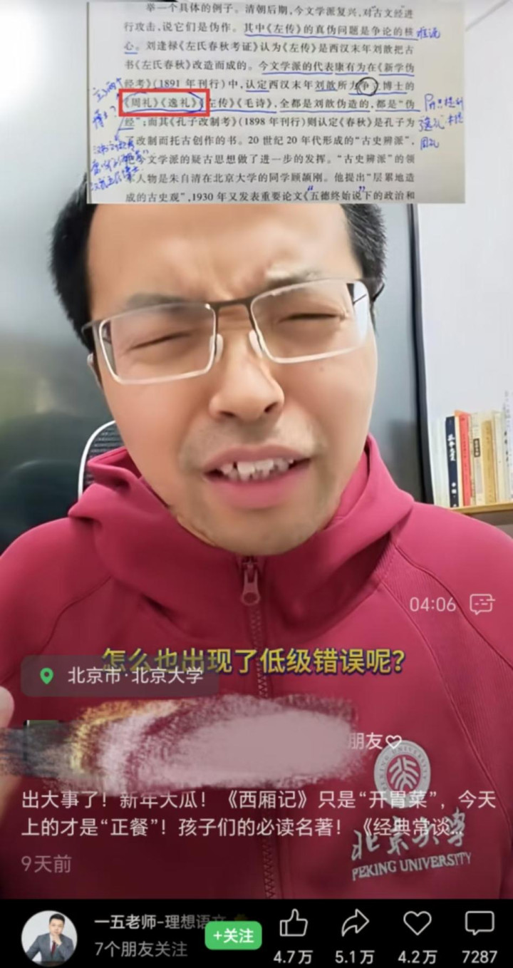 和许多人一样,作为老师、教育博主,“一五老师”并不避讳需要流量。但他坦言,从一开始,自己就不是奔着流量而去挑错。“我不会以这样的方式专门去搞流量,那样就成了表演,我是有底线的。”他举例,许多人看到的是他发布了多个视频连续讨论《经典常谈》的错误。但实际上,三年前他就已经发现了错误,但当时他并未公开“发言”。