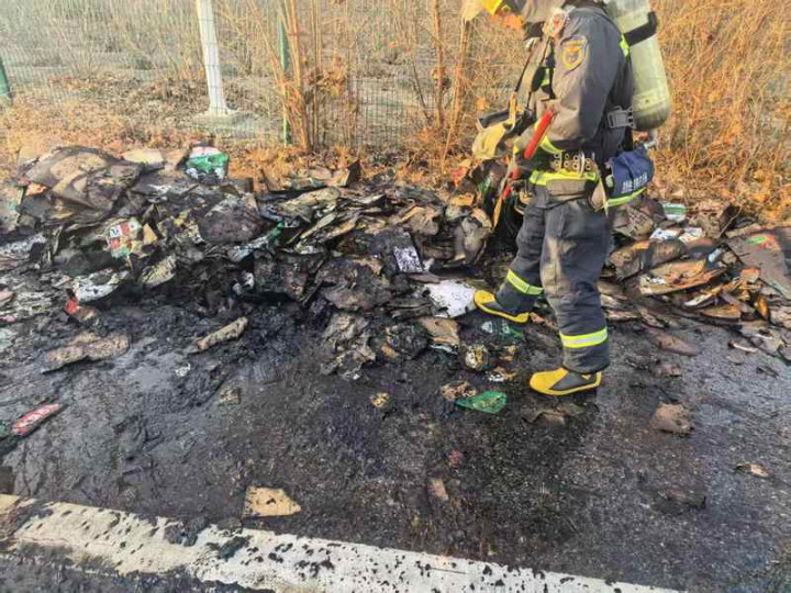 “我们到场后,发现一辆白色小型货车停在路边,车斗后地面上散落着被烧焦的纸壳,仍有部分纸壳在阴燃,并伴有浓烟冒出。”消防员用水枪灭火后,又对车斗及地上烧毁的纸壳进行仔细检查,确保没有复燃可能。