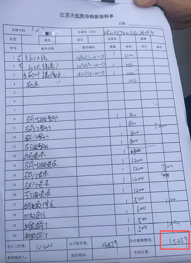 徐先生回忆,此次事件的源头,是自家孩子2025年10月上旬出现的一次肇事,“我孩子骑着电动车撞了辆特斯拉,撞车后孩子离开现场,后续是车主报警,警方找到我孩子,因为孩子刚毕业,且仅是骑着电动车,交警就建议我们私了。据孩子的说法,他接受了车主要到4S店修车的要求。2025年10月7日,4S店定损后手写了一个报价单,上面显示,需要维修或鉴定的项目为24项,结合工时费和配件费,总费用15259元。”徐先生称,他孩子在确认了维修单后,车辆便交给4S店维修。
