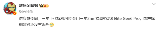 [CNMO科技消息]1月28日,数码爆料博主“数码闲聊站”透露了一则供应链消息:三星下一代旗舰手机(预计为S26系列)可能将采用一款基于三星2nm工艺特调的“骁龙8EliteGen6Pro”移动平台。