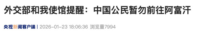 1月23日,外交部领事司发文,提醒中国公民暂勿前往阿富汗。