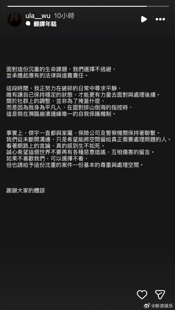 对此,吴侑函回应称不会逃避,针对拉黑遗属一事,开云她解释并非为了掩盖什么,“而是我作为一个普通人,在面对铺天盖地的指控时,这是我在濒临崩溃边缘唯一的自我保护机制”,表示“杰宇一直都与家属、保险公司及警方保持联系”,希望大家停止造谣和互相伤害。(新浪娱乐)