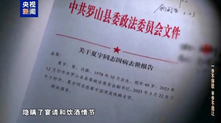 《一步不停歇半步不退让》披露,死亡的是罗山县委政法委副书记夏宇。片中提到,当天下午4点多,李献林得知参与饭局的夏宇酒后死亡,没有立即向组织汇报情况,开云反而试图隐瞒真相,把县里参加饭局的干部叫到一起来商量对策。